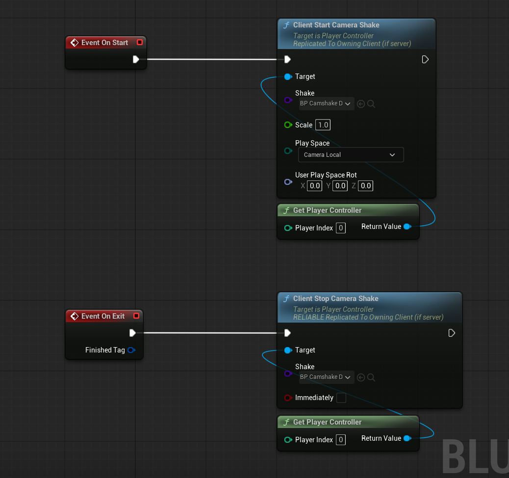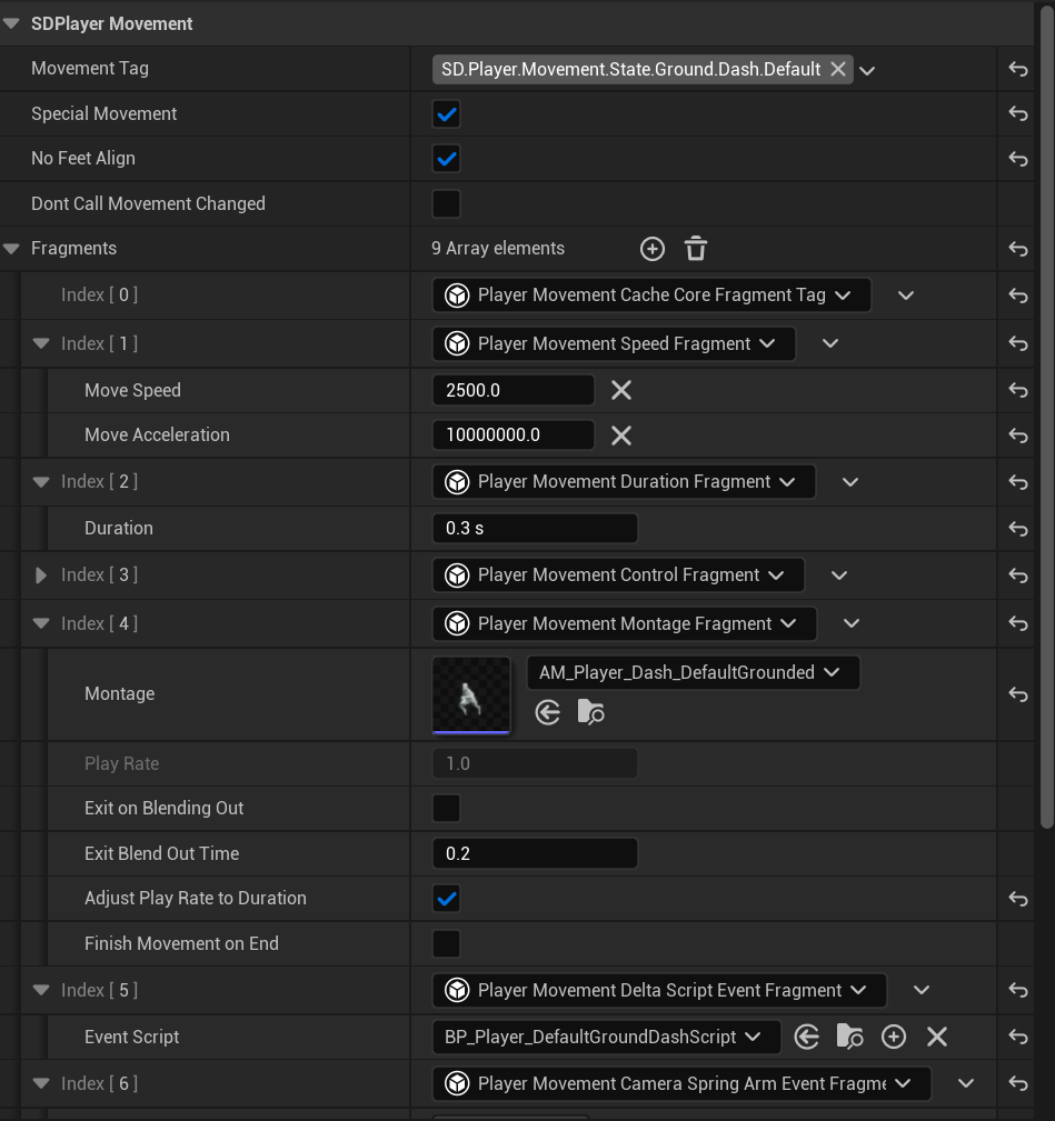 - Running external Blueprints called "Scripts", mainly used for more game feel effects like camera shakes or flow logic like switching to another player move/state