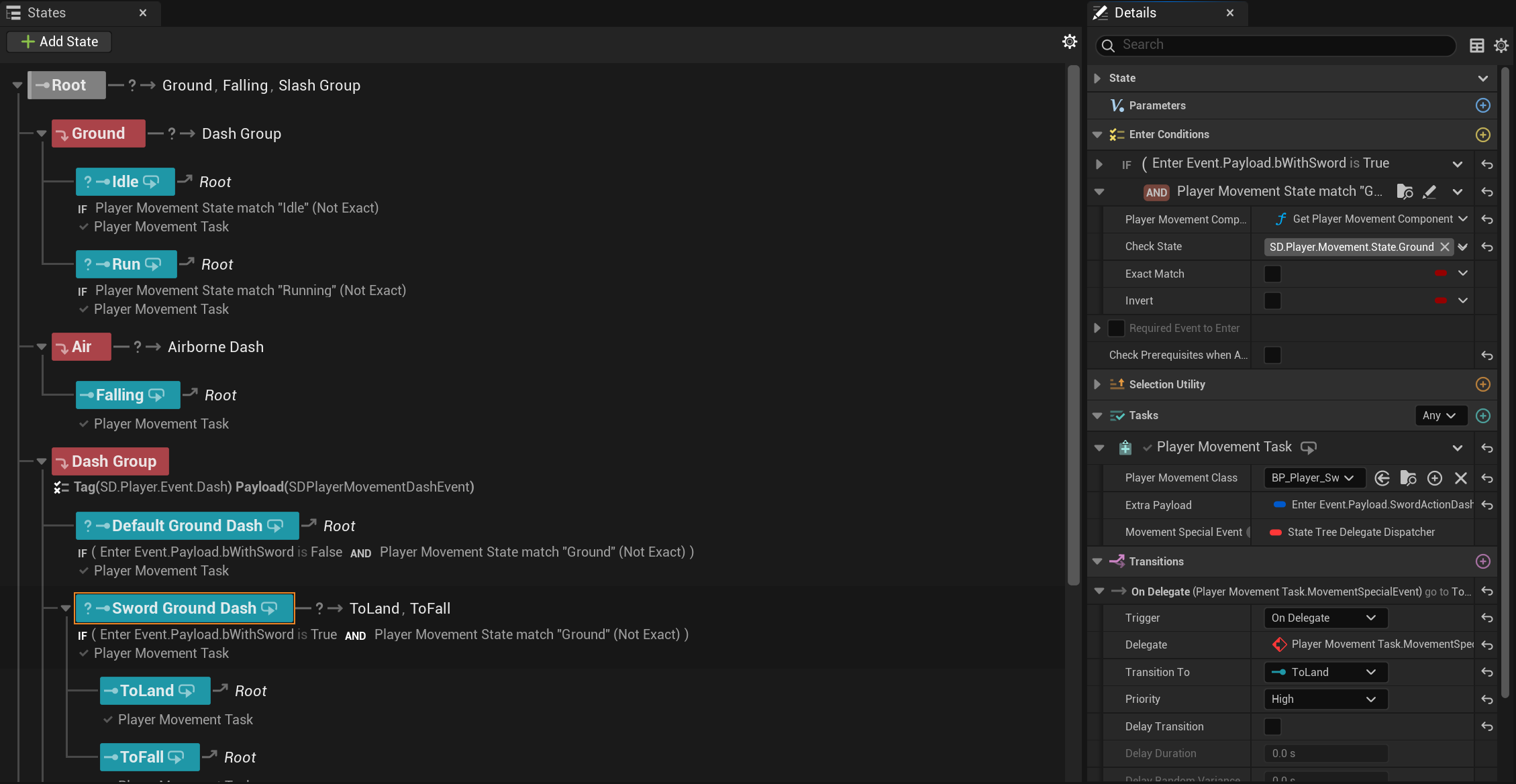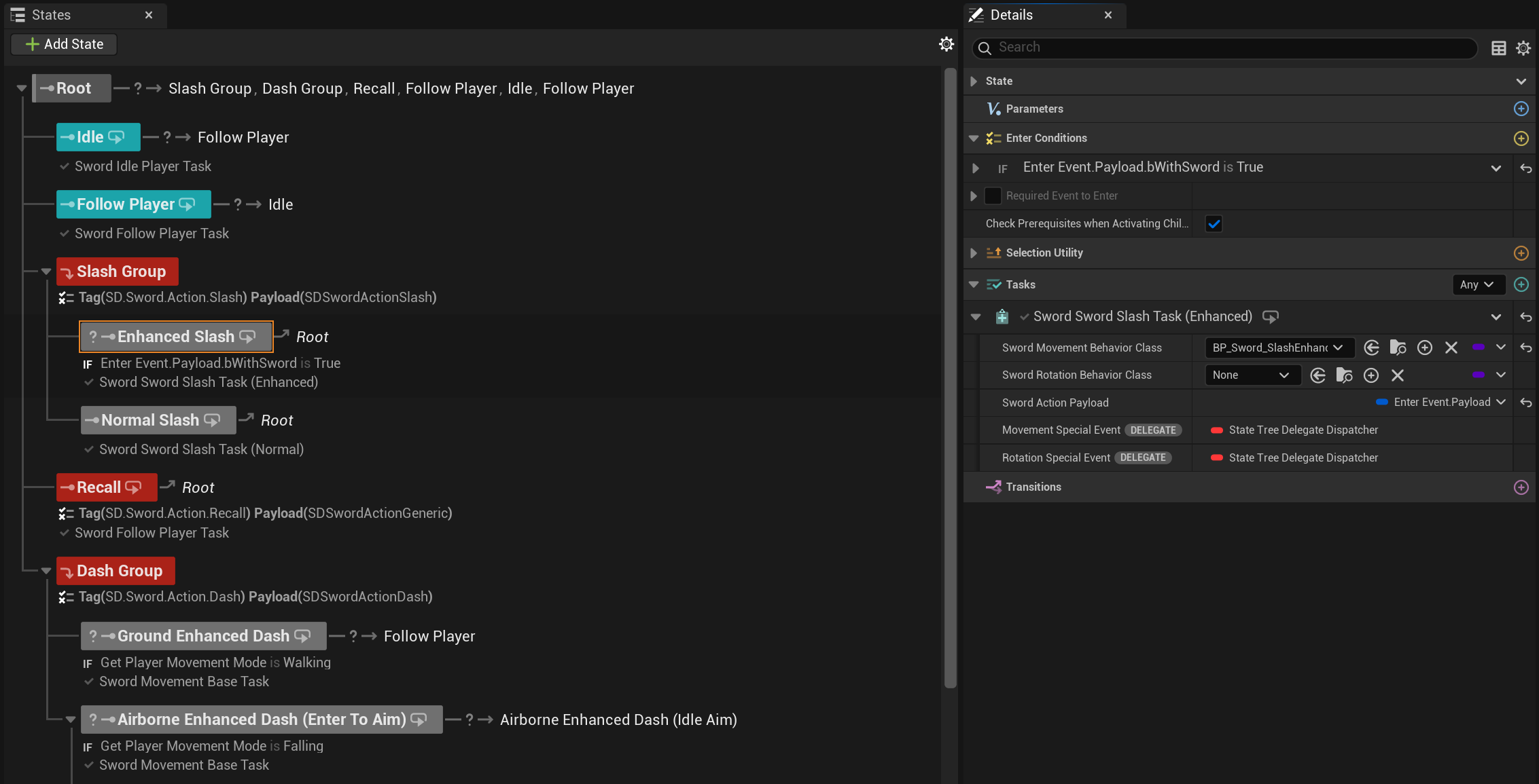 State Trees were used as the authority for managing the states of the Player and the Sword (one for each).