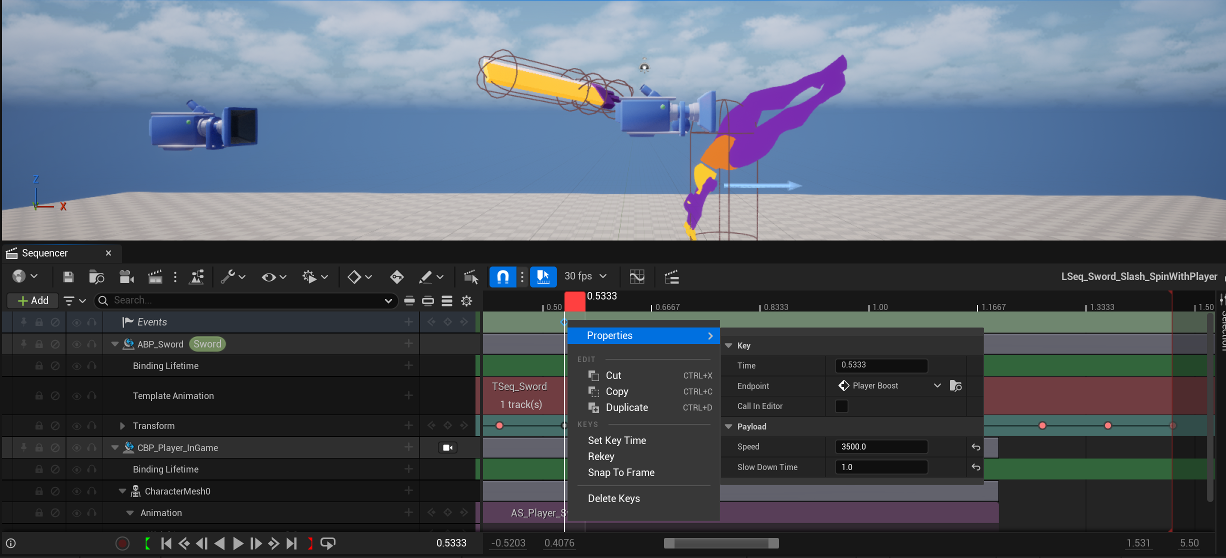 The sword moves using physics. For custom contextual actions such as the sword dash we use sequencers.