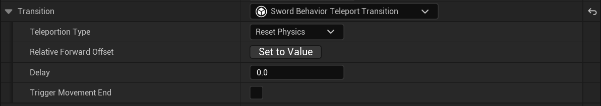 The Transition section is for moves that require the sword to do something before running the behavior, for example teleportation to match the move start location for the upcoming sequencer.