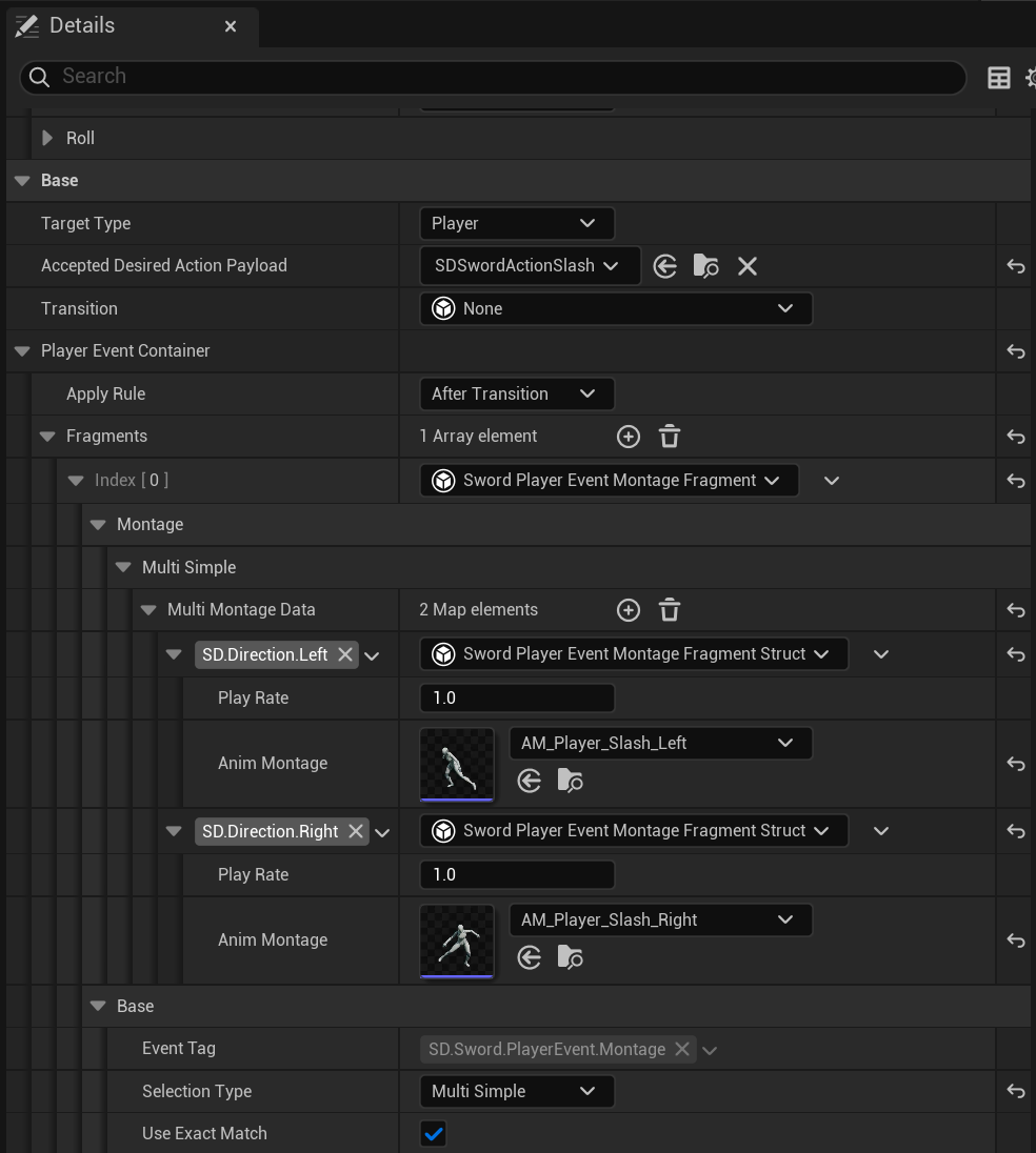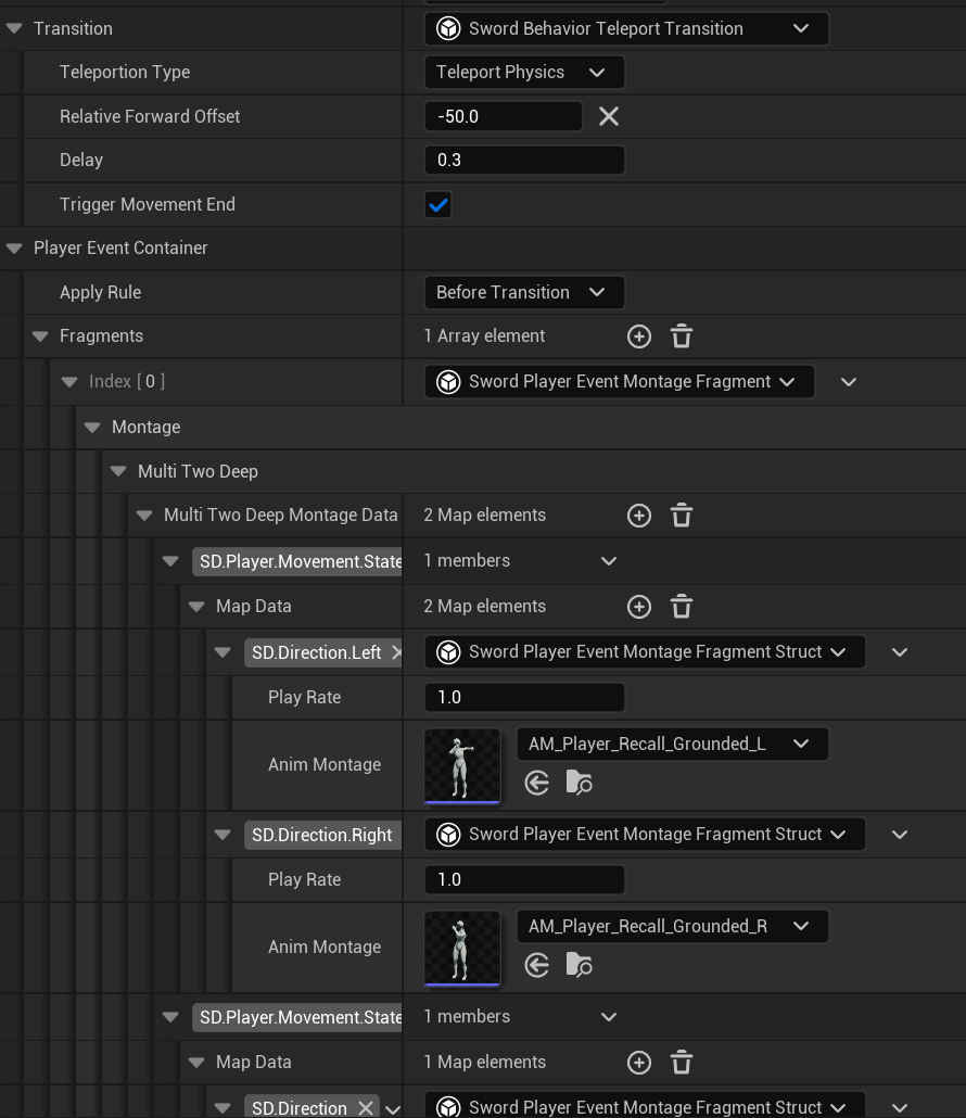 The player has a movement set, some of them can be enhanced or unlocked when using their sword. Because of the possibilities of these moves (conditions, transitions, combos, context, ...) I had to plan a robust system where planned moves could be defined in Blueprints and future movements and tweaks/patches could be implemented without slow iterations.